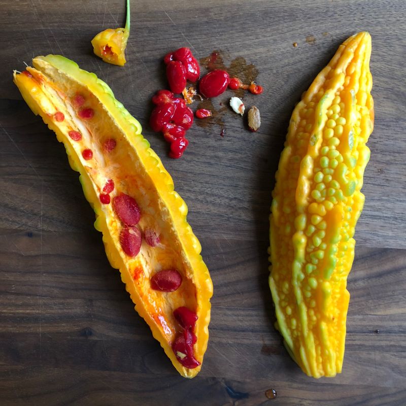 Despite bitter melon looking like an alien, it's a familiar vegetable to many people. The two kinds -- Momordica charantia (balsam pear) and Momordica balsamina (balsam apple) grow as vines. They are native to Africa, India, and Southeast Asia, and arrived in Europe in the 16th century and came to the Americas and Caribbean in the 17th century. The squat balsam apple is inedible, according to this botanical article. What we commonly eat as bitter melon is the balsam pear -- Momordica charantia.