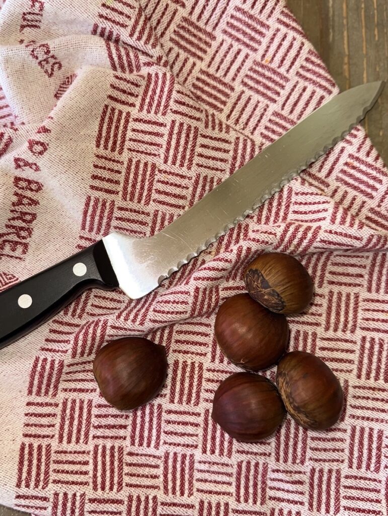 You don't need much but a serrated (bread) knife is very useful. Mine is an offset bread knife that's shaped like a bayonet; it's been with me for prepping banh mi and now chestnuts! It acts like a saw to cut through the shell during prep. A paring knife or curved bird's beak paring knife will help you get at niggly bits stuck in the crevices of the chestnut flesh. I roast the chestnuts in an oven, though if you have a toaster oven, you can use it instead, especially for small batches. My oven heat is more even than that in the toaster oven. For steaming the chestnuts after roasting, double fold a hand towel and line a bowl with it. Baking sheets are very handy for roasting and containing all the shell and skin bits.