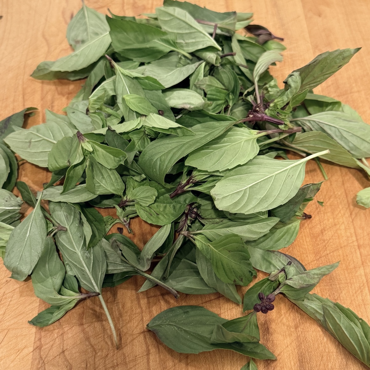 To use frozen Thai basil leaves: Only thaw what you need. Expect to use about one third more than what the recipe calls for in fresh Thai basil leaves. That's because blanching and freezing removes some of the fresh flavor. Plus, you can never have too much Thai basil so why not err on the side of using more for a dish?