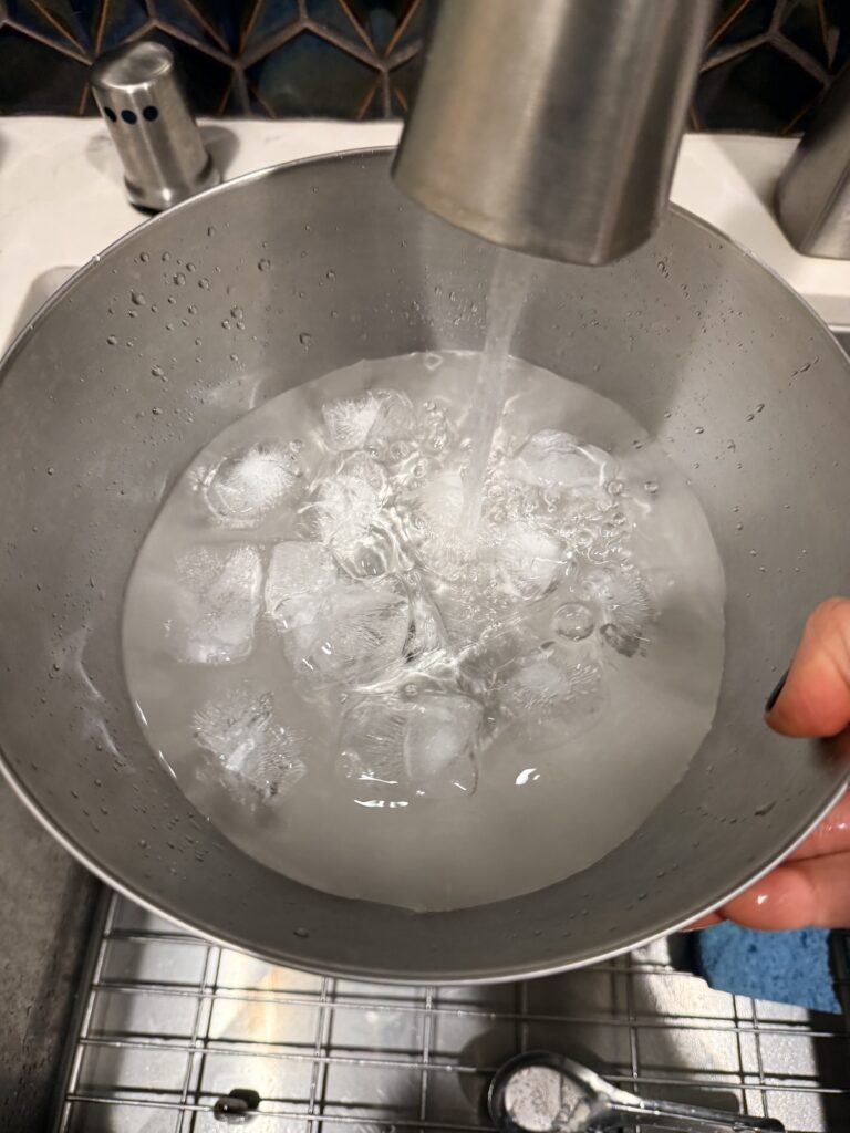 Very quickly blanch: Meanwhile, get a large bowl and put an ice tray's worth of ice cubes (about 12) in the bowl. Add enough water for the ice to float. When the pot of water comes to a boil, put all the basil leaves into the strainer then dunk it into the pot. If needed, gently stir the leaves to submerge and wilt them all. The dunk-and-wilt step should only take 2 to 3 seconds total. I've let it go longer and lost flavor to the water in the pot. Afterwards, if you spot discolored leaves like the one in the right hand photo at center, remove them if they are too dark and sad in color and flavor.