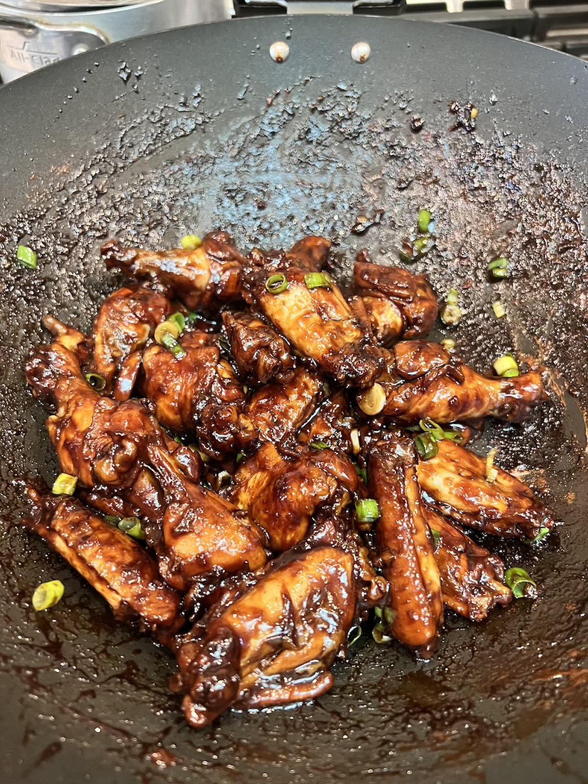Smart pan selection: Cooking this dish gets the pan coated with messy good, sticky bits. With repeated rounds of testing the wings, I found that a nonstick pan works great for clean up. I used a Joyce Chen Excalibur nonstick coated wok for most of the recipe testing. It was super easy to clean between batches. I reviewed the wok a while ago and till today, the nonstick coating has held up and not disappointed. It's great for these wings and more.