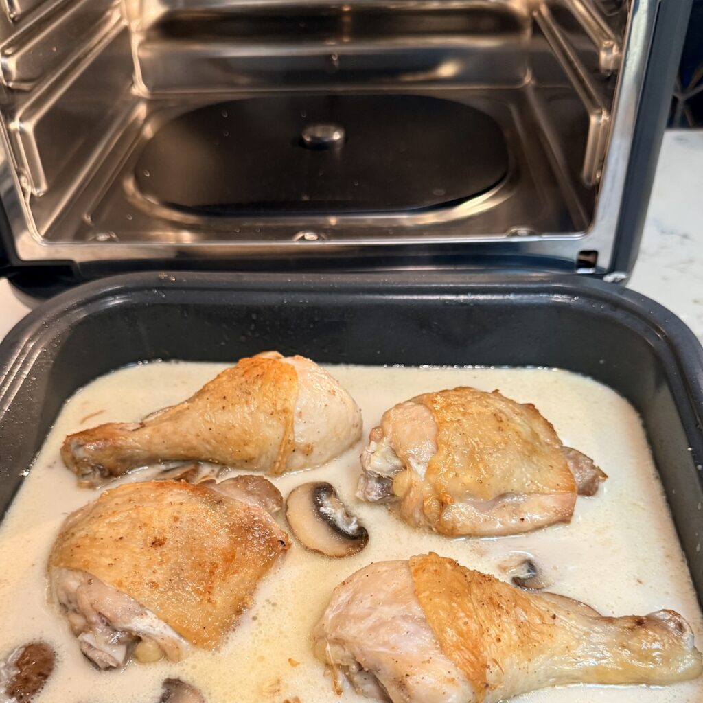 - Using the Air Fry/Stovetop mode, set the oven to SEAR / SAUTE at medium heat (default). When hot, add the oil to the deep Combi cooker pan. Add the chicken, skin side down. Let let sear 3 minutes, undisturbed, until pale gold. Stop the Ninja Combi and leave the pan in the oven.